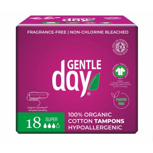 Plastic-free organic cotton GENTLE DAY® tampons prevent skin irritation and vaginal dryness. Patented COTTONLOCK systems prevents the tampon from fibers shedding.